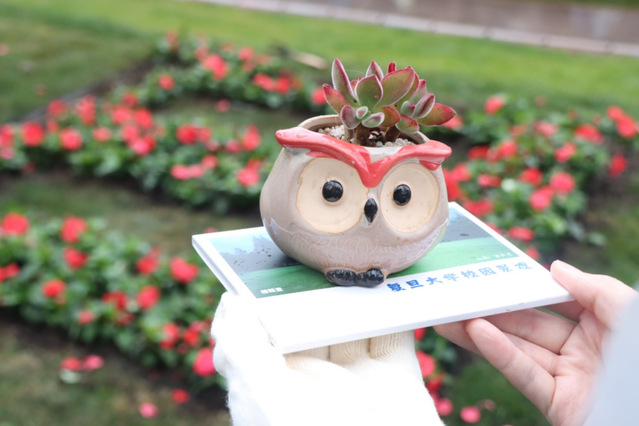 今天,雨霏霏,但复旦人在植树节为母校赠送一份百廿生日礼物的热情不减。我也有幸参与这快乐而光荣的仪式,握紧铲,扬起土,拍平丘,庄严而自豪之感油然而生。光草东侧,从此便多了一桃一李;桃树枝头,从此也多了一纸红笺,上题“桃李不言,下自成蹊。”桃李留在了校园,而我也带走了一盆小绿植,她将伴我灯旁,算是,母校回赠我的礼物。以后每每看见她,便会想起植树节和母校的双向奔赴。
