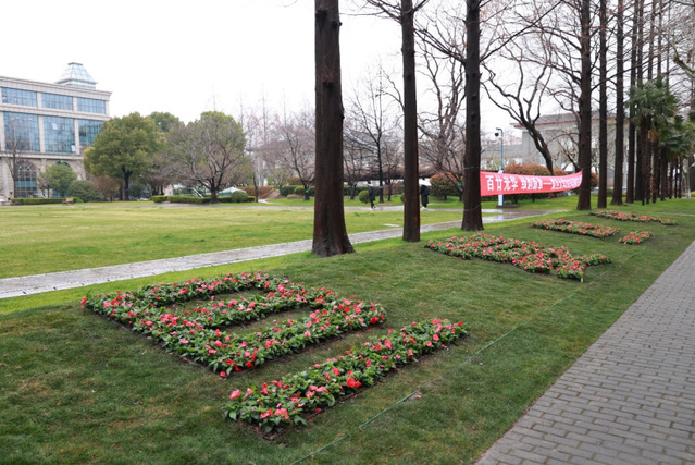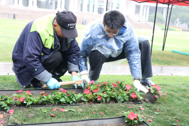 绵绵春雨中,专业人员为师生细致讲解种植技巧,随后师生们分为四组投入种植环节。一部分师生用凤仙花打造“百廿光华·旦复旦兮”花带,师生们默契配合,将百余株花苗精心栽植,花瓣与青葱草坪相映成趣。