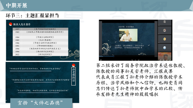 “大师之品德”。组二代表李泽圆同学汇报了访谈孙关宏老师的情况,以丰富的一手材料,展现了陈教授如何将育人成材、治学报国的远大目标化为日常生活点滴行动。
