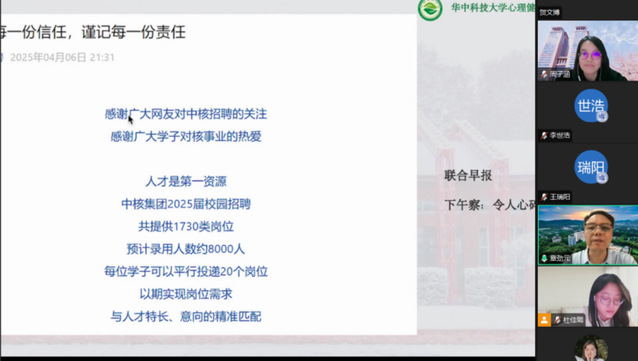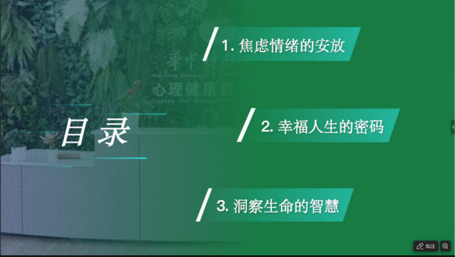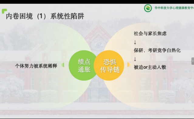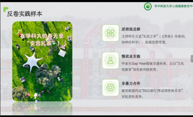 “我们现在之所以这么焦虑、这么卷是因为我们想要追求自己的幸福人生。讨论这个话题是对当下生命状态的反思。” 4月9日晚,华中科技大学心理健康教育中心主任章劲元老师带来了一场线上讲座——《反内卷生存手册:在躺和卷之间找到第三种可能》,用独特的视角和真实的案例,为同学们拆解了内卷困局,并分享了“既不躺平也不硬卷”的生存智慧。