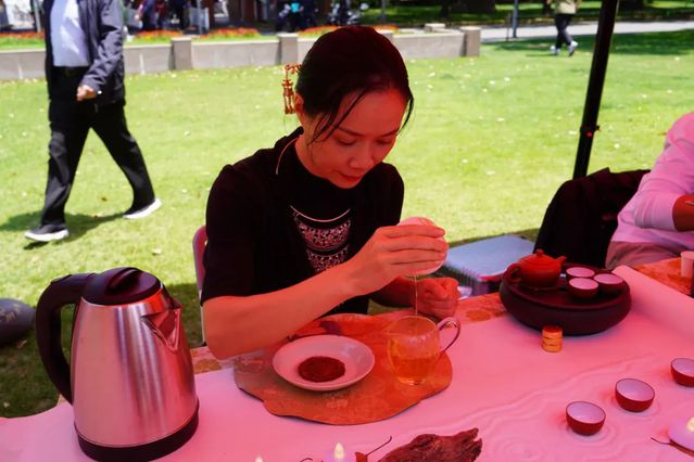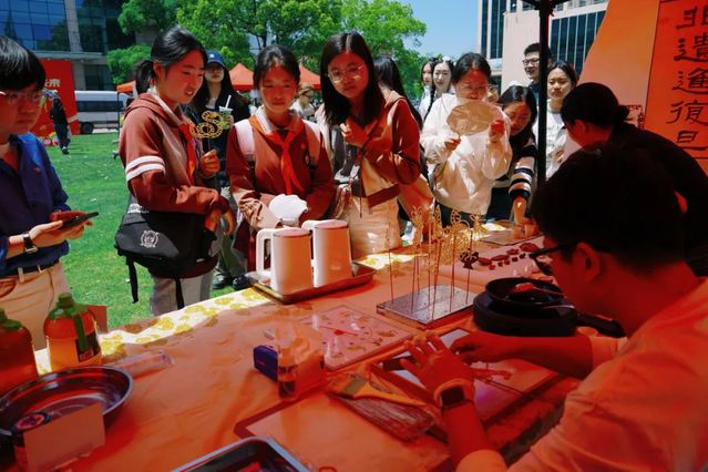 这里不仅是味蕾的乐园,更是文化的课堂。各民族师生们在品尝美食的同时,还能参与民族美食相关的答题互动,在大饱口福的同时增长民族饮食文化知识。该展区还邀请了非遗文化推广者糖画艺人与茶艺师,糖画艺人手腕翻飞勾勒出同学们喜爱的图案,茶艺师动作熟练而有力,为大家泡出最佳口感的茶品,让传统技艺焕发新生。