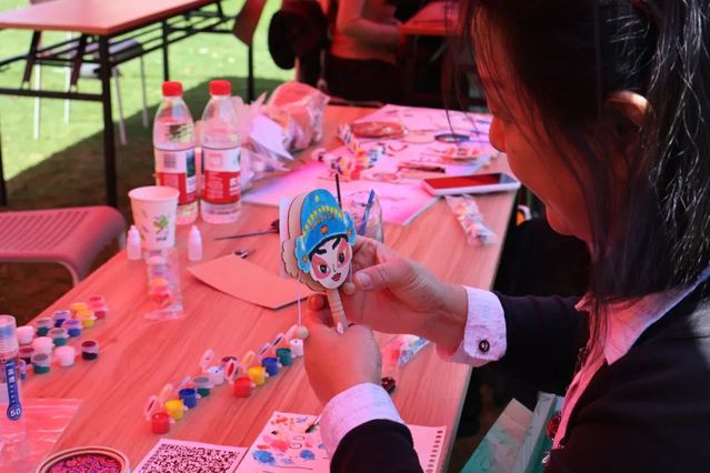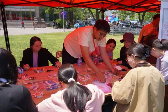 “匠心巧艺亭”手作区备受欢迎。彩绘民族风区域最为热闹,十几位同学手持细毛笔,在空白脸谱上勾勒出各具特色的民族图案。这里的工作人员们也始终保持着温暖的笑,耐心地指导各民族师生们参与苗韵宋锦贴、端午艾韵囊、扎染风尚包等制作。