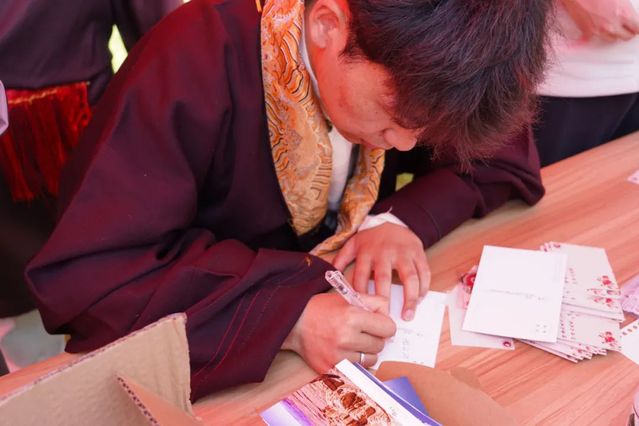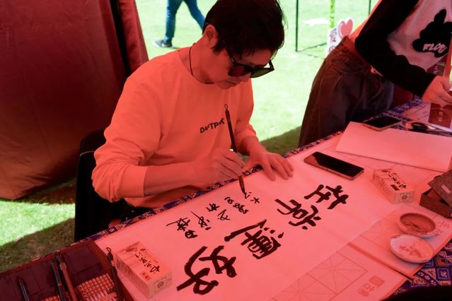 手作区还邀请了两位少数民族同学用民族文字为大家书写姓名或者其他喜欢的词语,拿到自己名字的同学们捧着纸张,小心翼翼地将它们带回。阳光透过帐篷洒在书写区,为这温馨的文化交流时刻镀上一层金色的光晕。