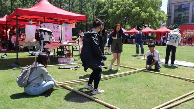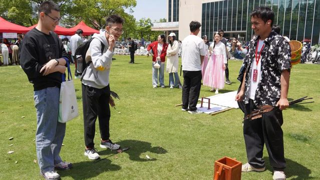 “石榴竞技园”欢笑声此起彼伏。投壶区围满了跃跃欲试的同学,有人屏息凝神瞄准壶口,箭矢入壶的清脆声响总能引发一阵欢呼。抛绣球、竹竿舞、捶丸、等民族民间体育让参与者们乐在其中,每个人都在活动中真切感受到了中华传统民俗的独特魅力。
