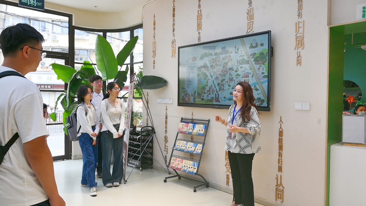 会后,同学们参访了国定支路睦邻街区。街道工作人员介绍,街区服务对象以老人和儿童为主。工作日上午,老人和儿童会聚集在人人会客厅、人人书屋等空间内,享受公共文化与社会服务。人人会客厅不仅提供党建、社会保障、法律咨询等服务,还面向不同群体开展中医调理、手机摄影、手工编织、绘本阅读等课程。