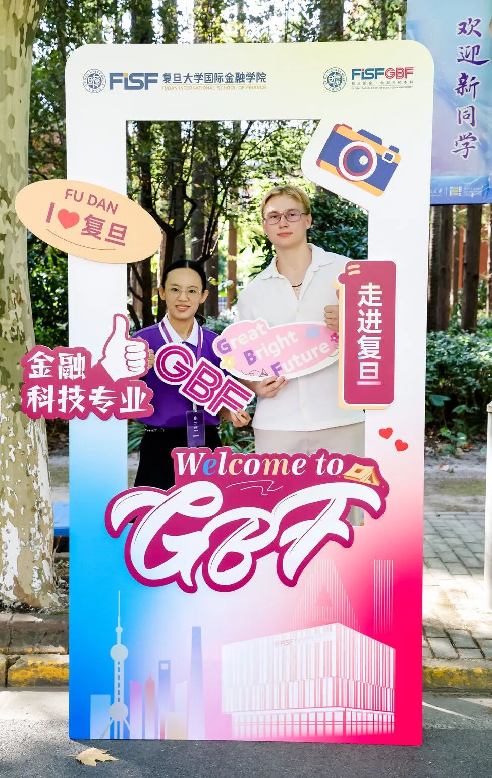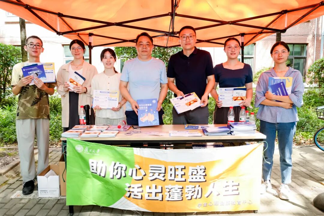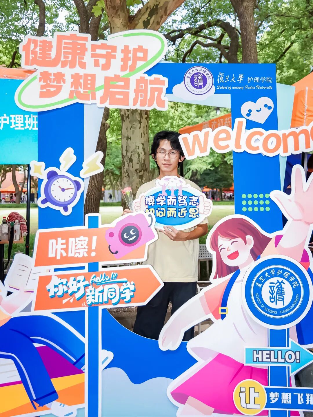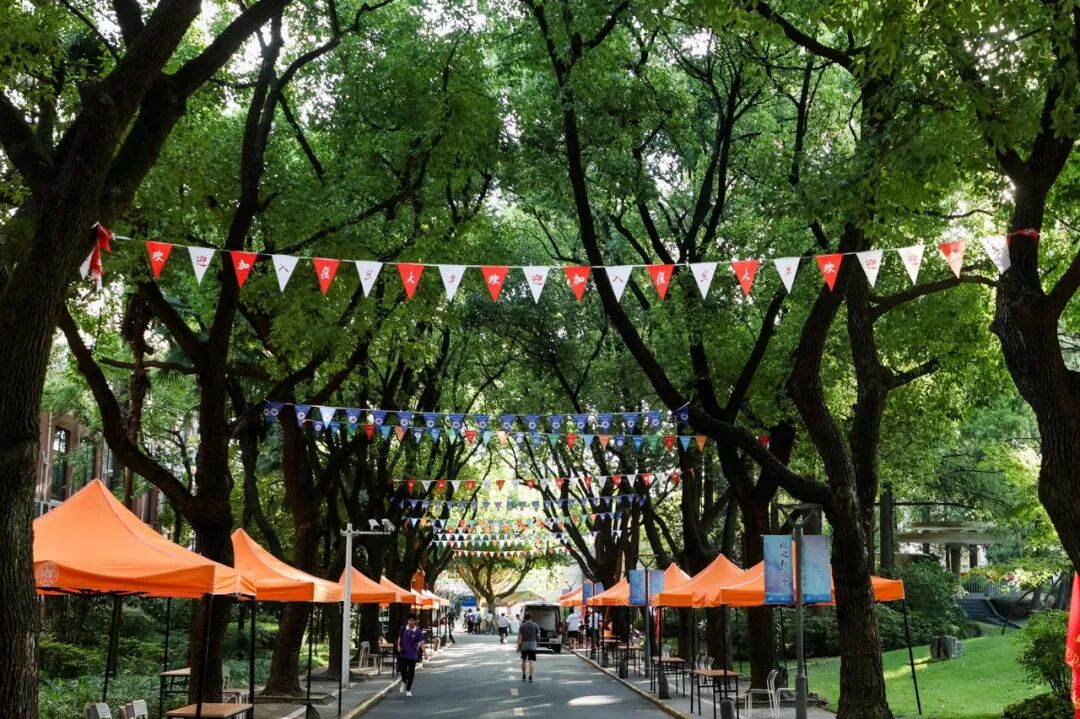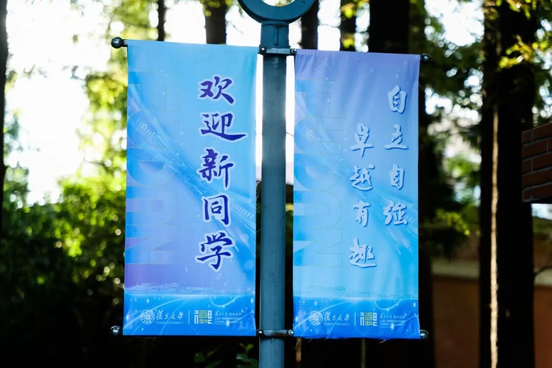 缀满其间的 “欢迎加入复旦大学” 三角旗