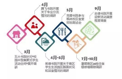 随后,书院学生代表分别就六大议题进行了主题汇报。志德书院监委会主任郑屿介绍了五大书院监委会联合开展的《关于南(东)苑宿舍修缮和园区生活》调研情况,并汇总了学生对于后续修缮项目的建议。该项调研共覆盖950位同学,调研结果表明,学生们对于修缮后21栋楼的寝室条件总体较为满意,各修缮项目成效得到基本认可。腾飞书院监委会主任邢儆则就园区安全问题进行了报告,从消防安全、人身财产安全、交通安全和园区卫生问题等四方面进行了相关问题汇总。