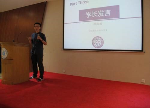 12级国际经济与贸易的徐浩栋学长也带来了非常精彩的发言,他结合自身在书院的四年经历,讲述了一路走来的心路历程,也对同学们提出了一些建议和忠告,同时也希望希德的老师和同学们能够乐在书院。