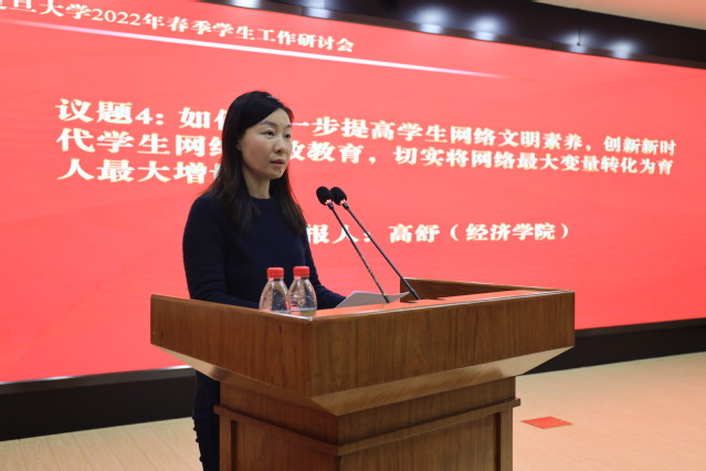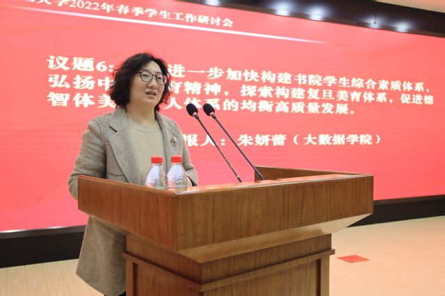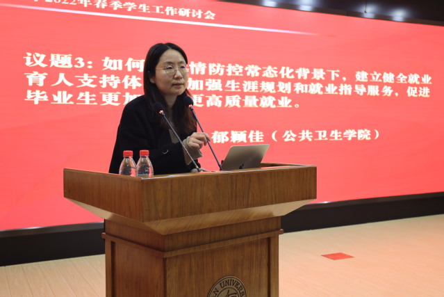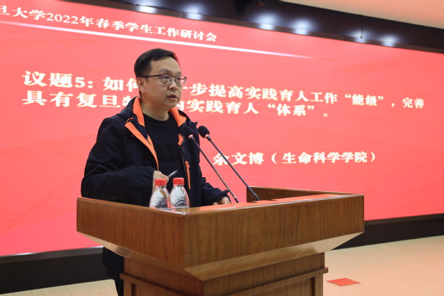 会上,院系学工队伍的9位代表先后进行了交流发言。新闻学院党委副书记陆优优分享了学院在2021年充分把握、因势利导政治大年学生工作机遇挑战,围绕“一个思想”“两大抓手”“三大空间”打造专业化、精细化、开放化“育人菜单”的特色做法。化学系党委副书记秦枫结合学生成长需求和学科发展需要,分享学院在培养一流化学人才过程中的探索与突破。中山医院学工部部长刘嫣介绍了中山医院在医学生守规教育和管理方面所作的思考与实践。哲学学院学工组组长汤克凤介绍了拓展专业教师合力育人、搭建全方位的一二课堂育人平台的特色经验。数学科学学院研工组长王周俊分享了学院坚持目标、问题、结果“三个导向”并聚焦学业、学风“两个建设”助力一流学科发展的工作思路。公共卫生学院学工组长尚珂从厚植学院底色、坚持知行合一两个方面分享了学院如何培养又红又专公卫人的经验做法。社会发展与公共政策学院专职辅导员唐博介绍了学院学生生涯发展教育情况,分享学院通过全过程生涯教育、助力更充分更高质量就业的创新做法。环境科学与工程系专职辅导员林子晗分享了自己面向“Z世代”学生群体开展入脑入心的、有质量的主题教育的感想与体会。信息科学与工程学院团委书记高丽梅从“夯实组织基础”“触碰科技前沿”“实践服务创新”三个方面介绍学院共青团工作,分享学院培养新时代青年、做卓越新工科建设者的做法。