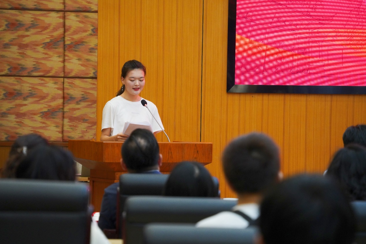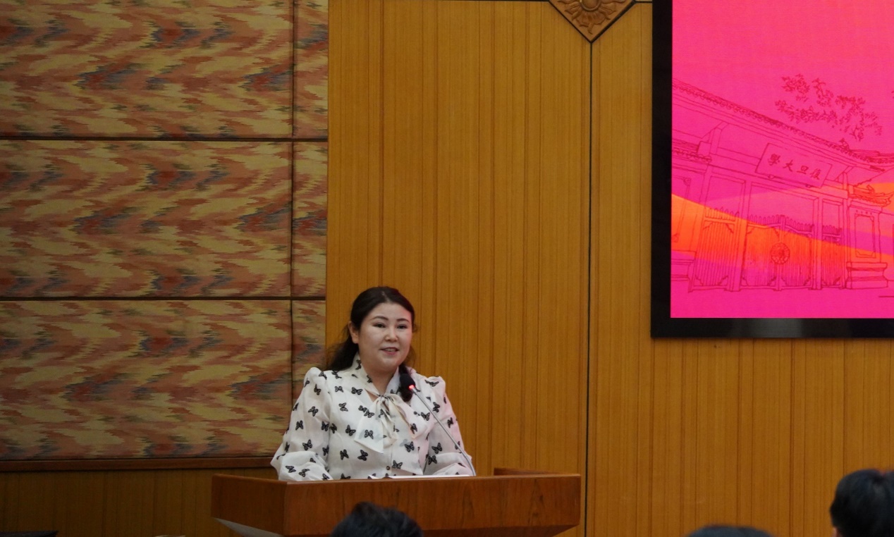 2022级预科班辅导员哈丽努代表辅导员发言。她深情回忆了预科一年全体同学团结进取成长为自信自立复旦人的成长经历,表达了对2022级预科生的祝福和感谢,鼓励同学们在本科阶段继续踏实努力、不骄不躁,将学习专业知识与时代发展、个人规划结合,承担起对国家、社会的责任,为成为卓越而有趣的复旦人而努力奋斗。