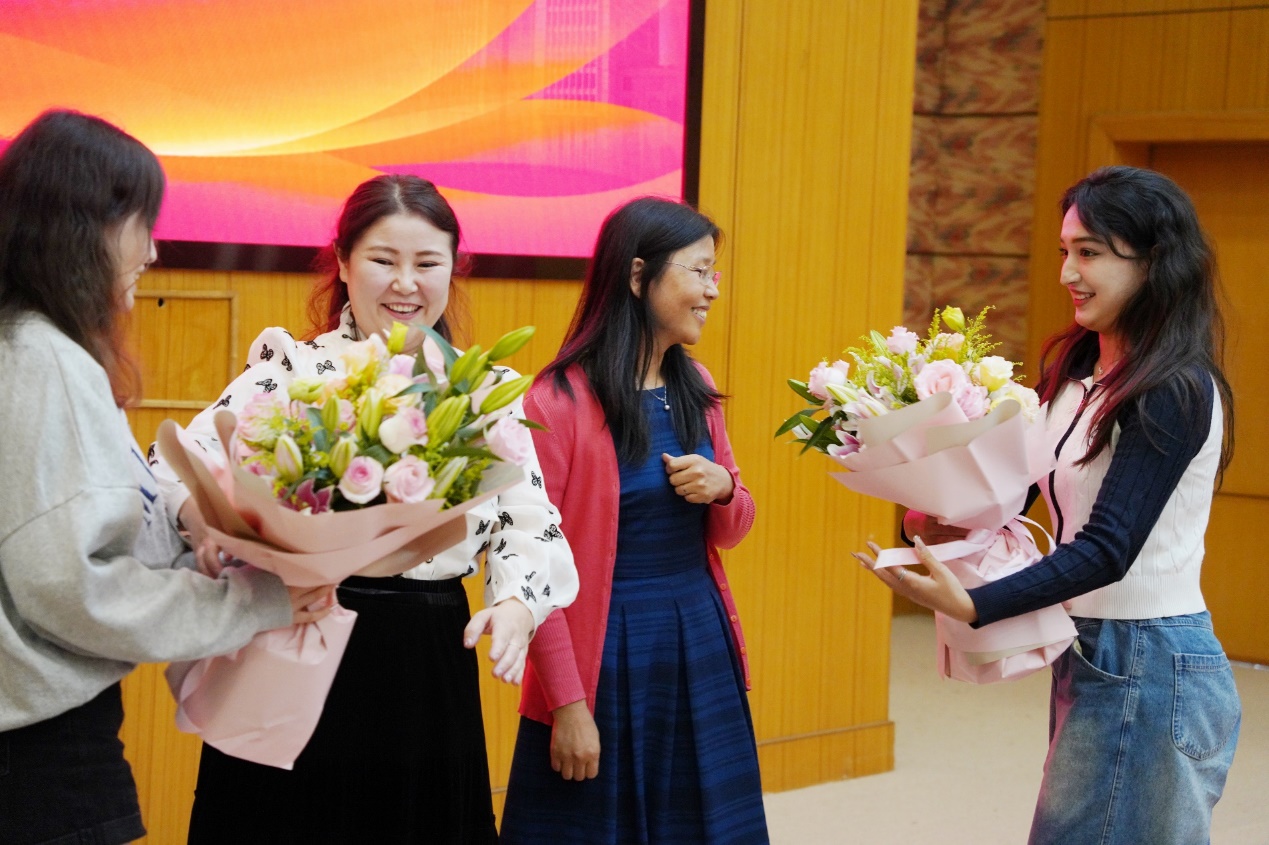 发言结束后,会场播放了由预科班同学制作的结业纪念视频。在一年的预科时光里,同学们不仅为本科的学习生活打好了基础,还与同学、老师们建立了深厚的友谊。随后预科班学生代表为任课老师和辅导员代表献花,感谢老师们一年的辛勤付出和用心陪伴。