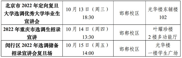 (1)选调生招录信息:各地区招录公告请关注就业信息网或“复旦基层就业”公众号,浙江省2022年选调生公告将于9 月30日发布,请动员有意向的同学踊跃报名并注意截止时间。
