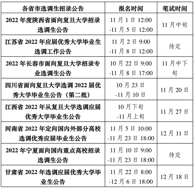 (3)选调生招录信息:各地区招录公告可关注就业信息网(公告新闻-公示公告)或“复旦基层就业”公众号,请动员有意向的同学踊跃报名并注意截止时间。