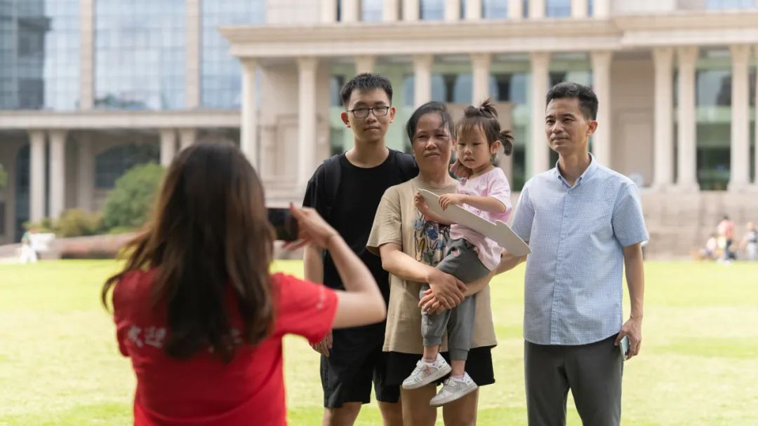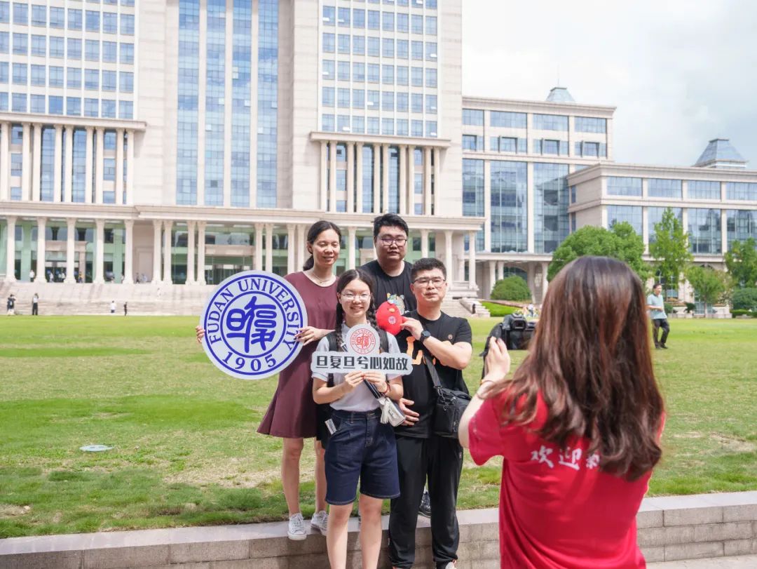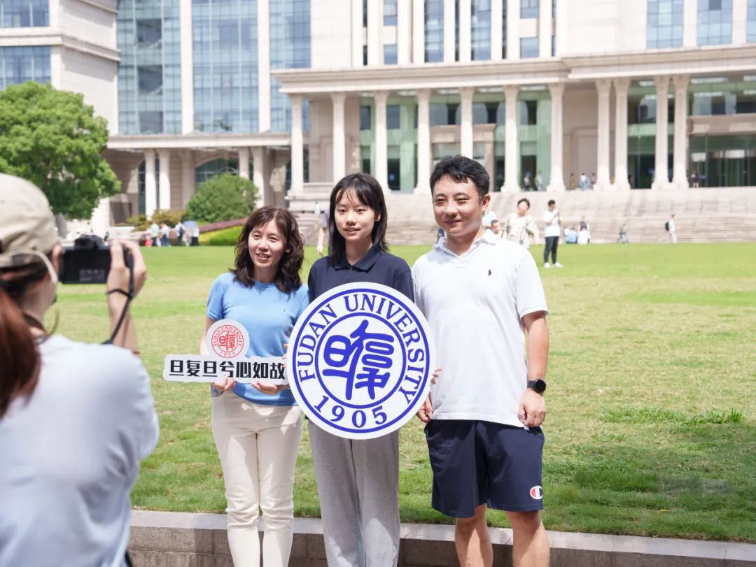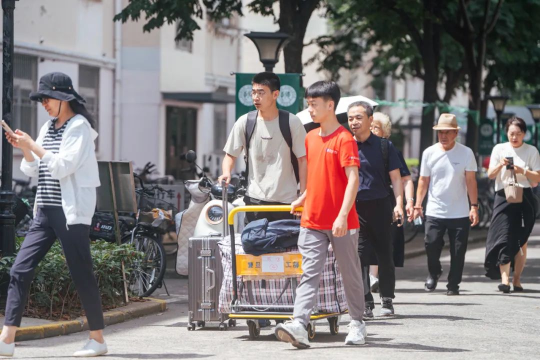 复旦园里,新生们与父母、家人结伴而行,完成报到流程,分享着入学第一天的喜悦。