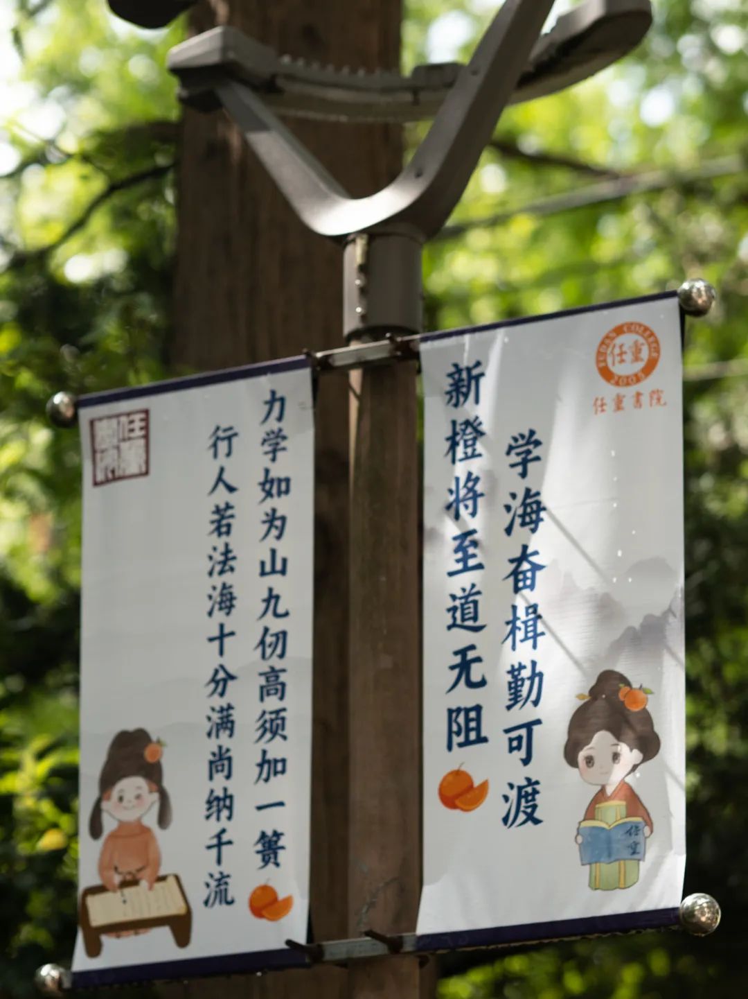 树木间拉起一道道迎新横幅
