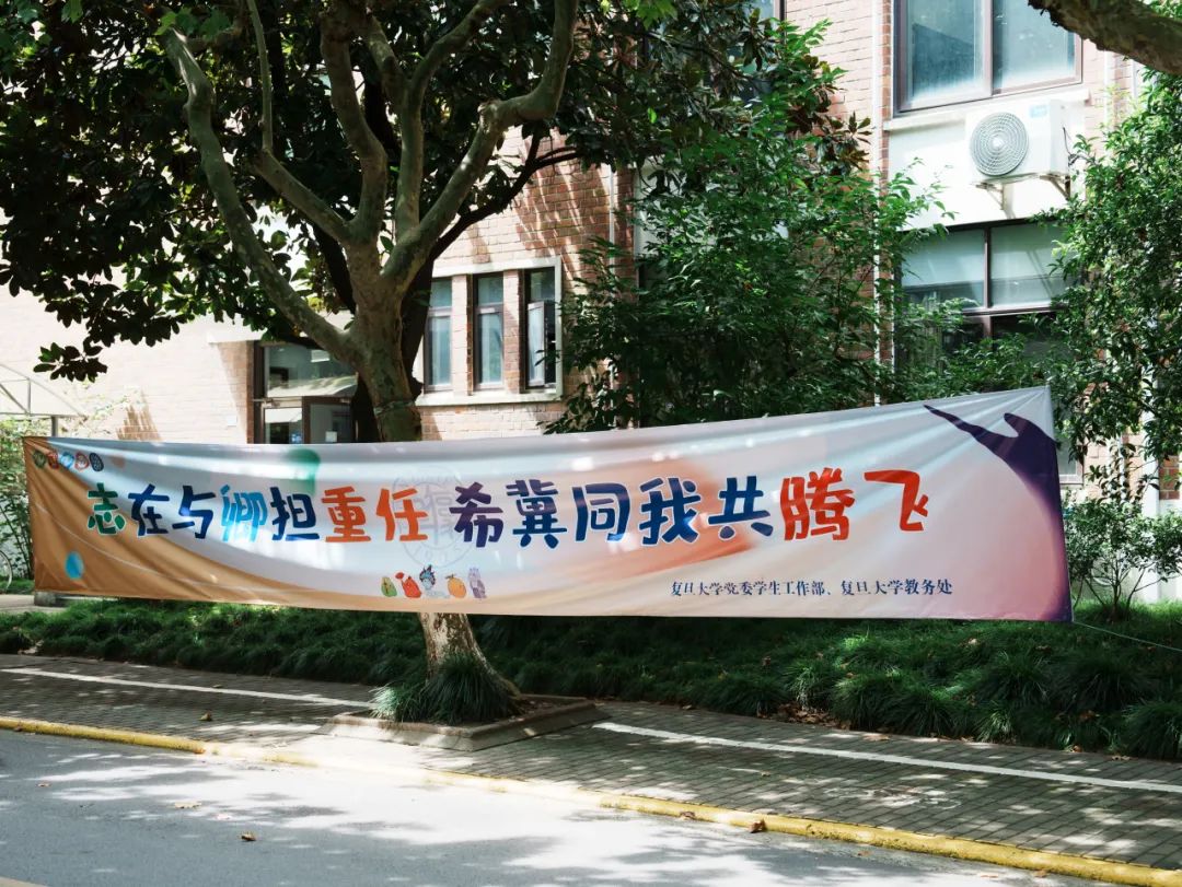 林荫路上,印有“欢迎新同学”、“希与卿度,任志腾飞”的道旗迎风飘扬,诉说百年复旦的文化传承。迎着晨曦,2023级复旦本科新生陆续走进复旦园,进行入学报到。