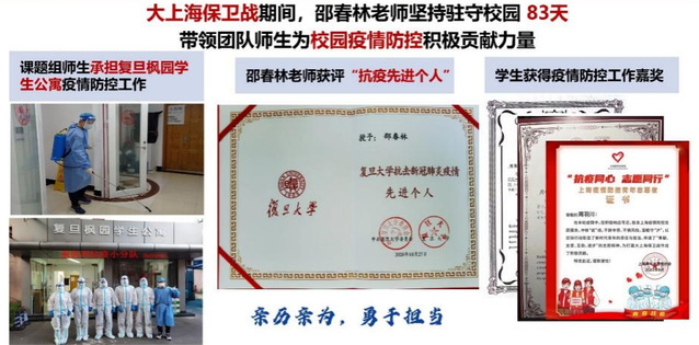 2020年以来,在校园各阶段疫情防控期间,邵老师率领团队研究生们承担起园区的疫情防控工作,保障师生正常生活和身心健康,并获评“复旦大学抗疫先进个人”;大上海保卫战期间,邵老师连续驻守校园83天,在邵老师的引领下,团队学生们积极承担起住楼辅导员、临时党支部书记和学生志愿者的组织工作,保质保量地完成了上海医学院枫园学生公寓和放医所的防疫任务。此外,团队研究生们积极参与学生工作,先后多人次担任放射医学研究所研究生党支部书记、团总支书记、放射生物部团支部团支书和宣传委员、心理委员等职务。邵春林老师积极承担学校的思政人才培养工作,培养了博士生王晨和宋义蒙两位复旦大学人才工程(二期)预备队队员,为学校增添了优秀的后备人才。其中宋义蒙代表复旦大学在第七届中国国际“互联网+”大学生创新创业大赛上首次获得金奖,实现了我校在“青年红色筑梦之旅”赛道上零的突破。