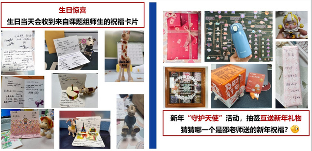 团队有一个由来已久的传统,即每逢课题组成员生日时,邵老师和张老师总会为大家精心准备一份小惊喜:一份写满团队成员祝福语的贺卡与吉祥物,使每个来自五湖四海的学子都能感受到这个大家庭的爱与温暖。每逢元旦前夕,团队还会有“守护天使”的秘密活动,默默守护抽到便签上名字的成员,互赠小礼品。这些活动迅速拉近了团队成员们彼此的距离,增进了互助互爱,让平凡的科研生活中充满了一份份温馨的小惊喜。
