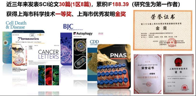 近三年来,团队师生们先后在PNAS、Cell Death and Differentiation、Autophagy、Theranostics等国际高水平期刊发表SCI论文30篇,累积影响因子达188.39,其中一区论文8篇。同时,积极促进科研成果转化,获得国家专利授权三项;积极服务社会、服务上海,开展上海市放射从业人员健康体检工作,年均转化130万以上。
