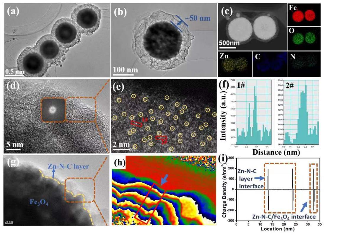 回到复旦大学后,黄梦秋采用了单原子掺杂策略来调节MOF衍生碳壳层的局域电势。经过简单的退火处理将单原子Zn和N均匀锚定在碳基体中,形成堆积杂原子掺杂的荚状介电壳层,限域转化构建原子级别极化单元,单原子掺杂使原子利用率达到最大,实现最大化偶极极化。但通过XRD等常规表征手段并不能检测到Zn/ZnO的特征峰,很难确定材料中的Zn(锌)原子的分布状态。通过单原子掺杂,其吸波性能有明显的提升效果,但如何能表征到Zn原子的分布状态呢?黄梦秋与导师时常讨论,尝试不同的表征手段也没有得到比较确切的结果。黄梦秋在文献中查阅到有用球差电镜来表征单原子的,但是球差电镜对样品要求很高,且当时先进材料实验室还不具备做球差电镜的条件,最后通过车老师的合作者,在双方多次制样和调试下,整个过程历时4个月,终于得到了一张满意的微观形貌图,能有力地证明其分布状态,最终此项工作发表在《Small》上。