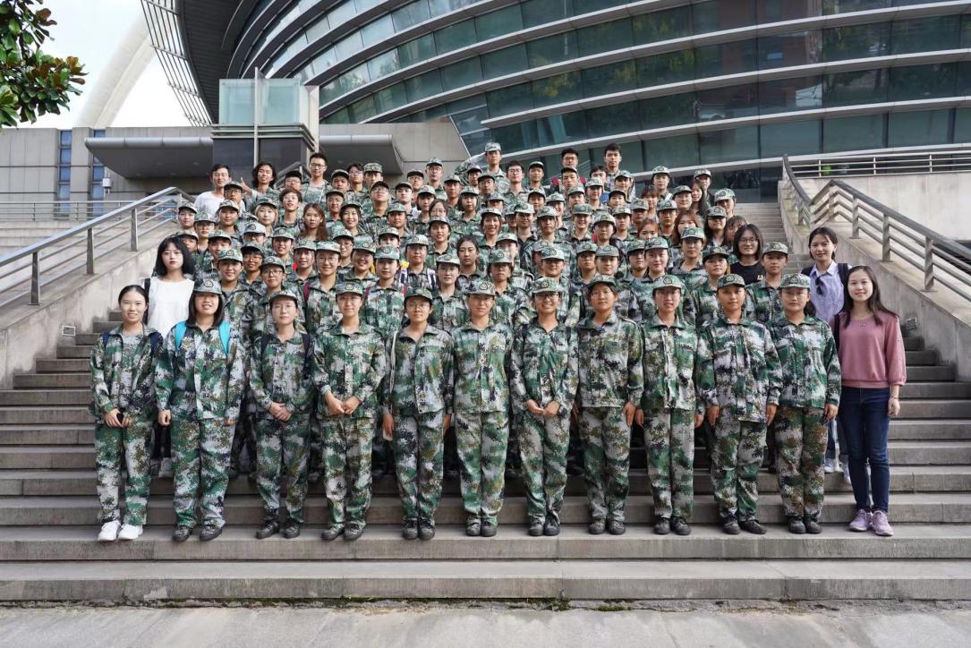 军训期间袁超颖与所带班级学生们的合影
