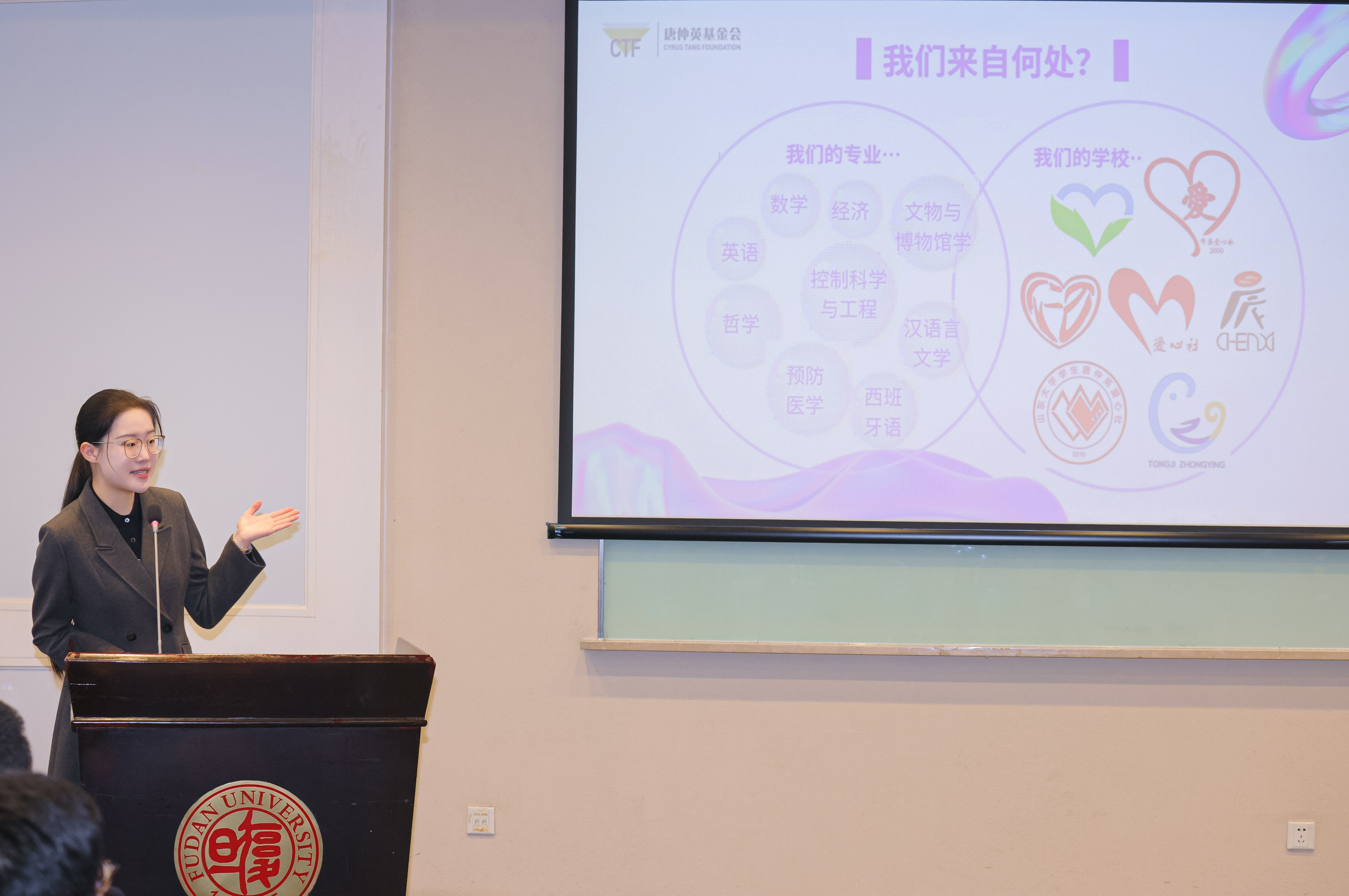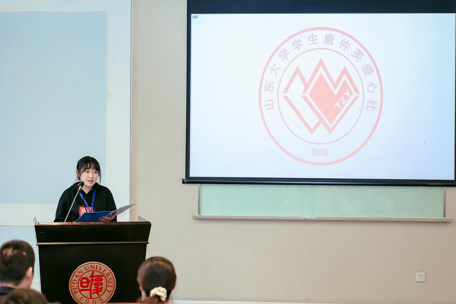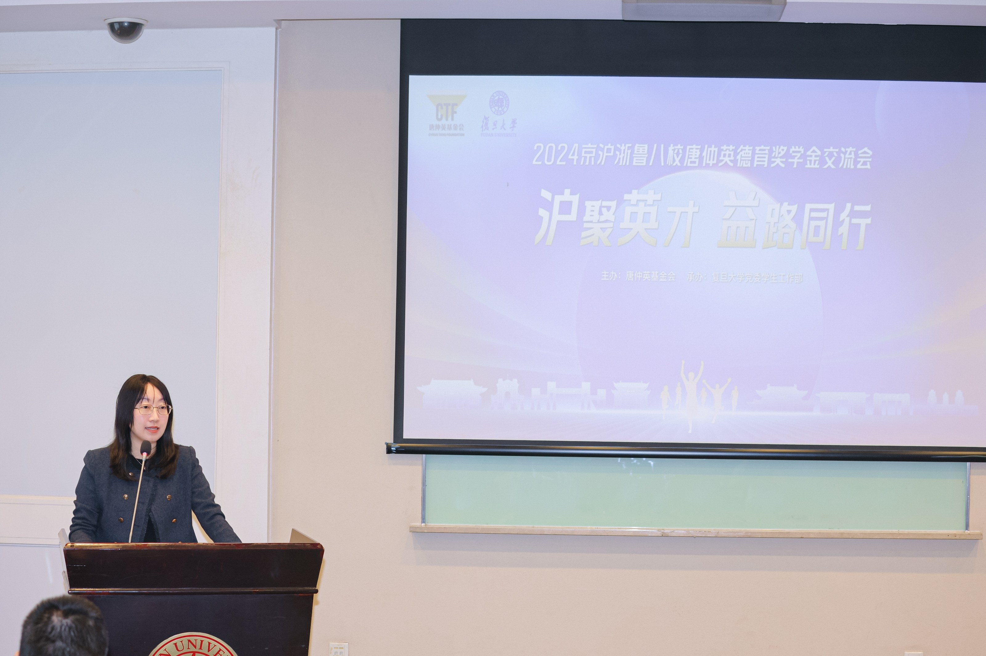 最后,唐仲英基金会项目主管于勤发表讲话,她向在座的师生讲述了唐仲英先生走上公益之路的人生经历以此激励同学们心怀感恩、回馈社会,并再次对复旦办会、八校参会给予的支持表达感谢。