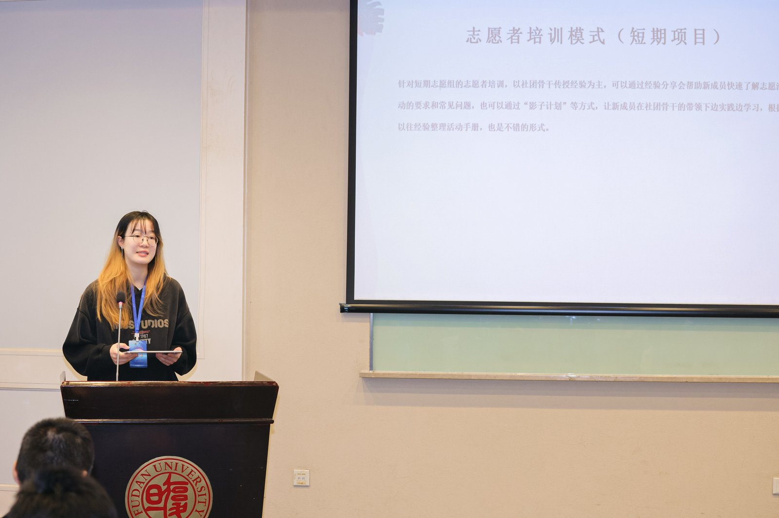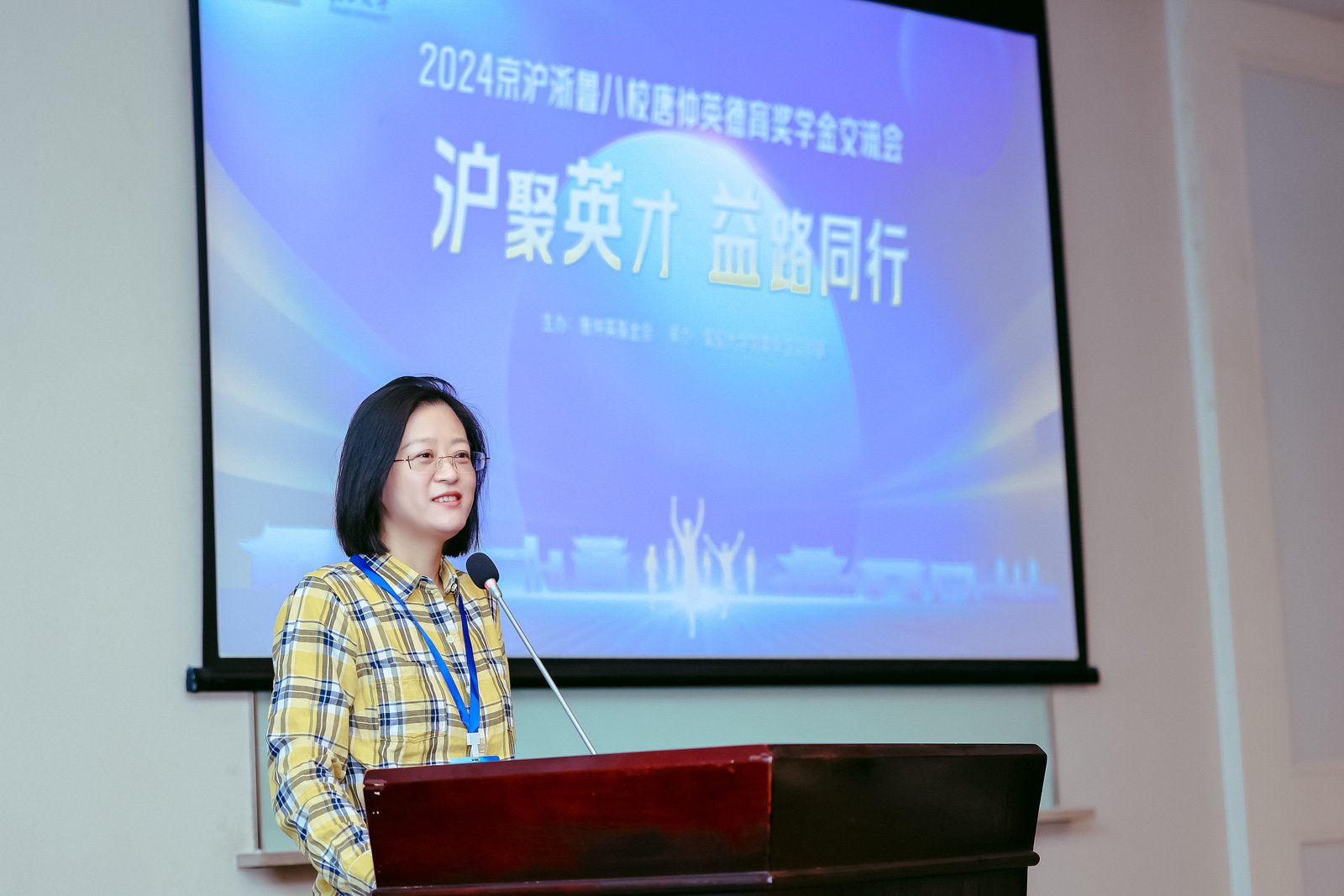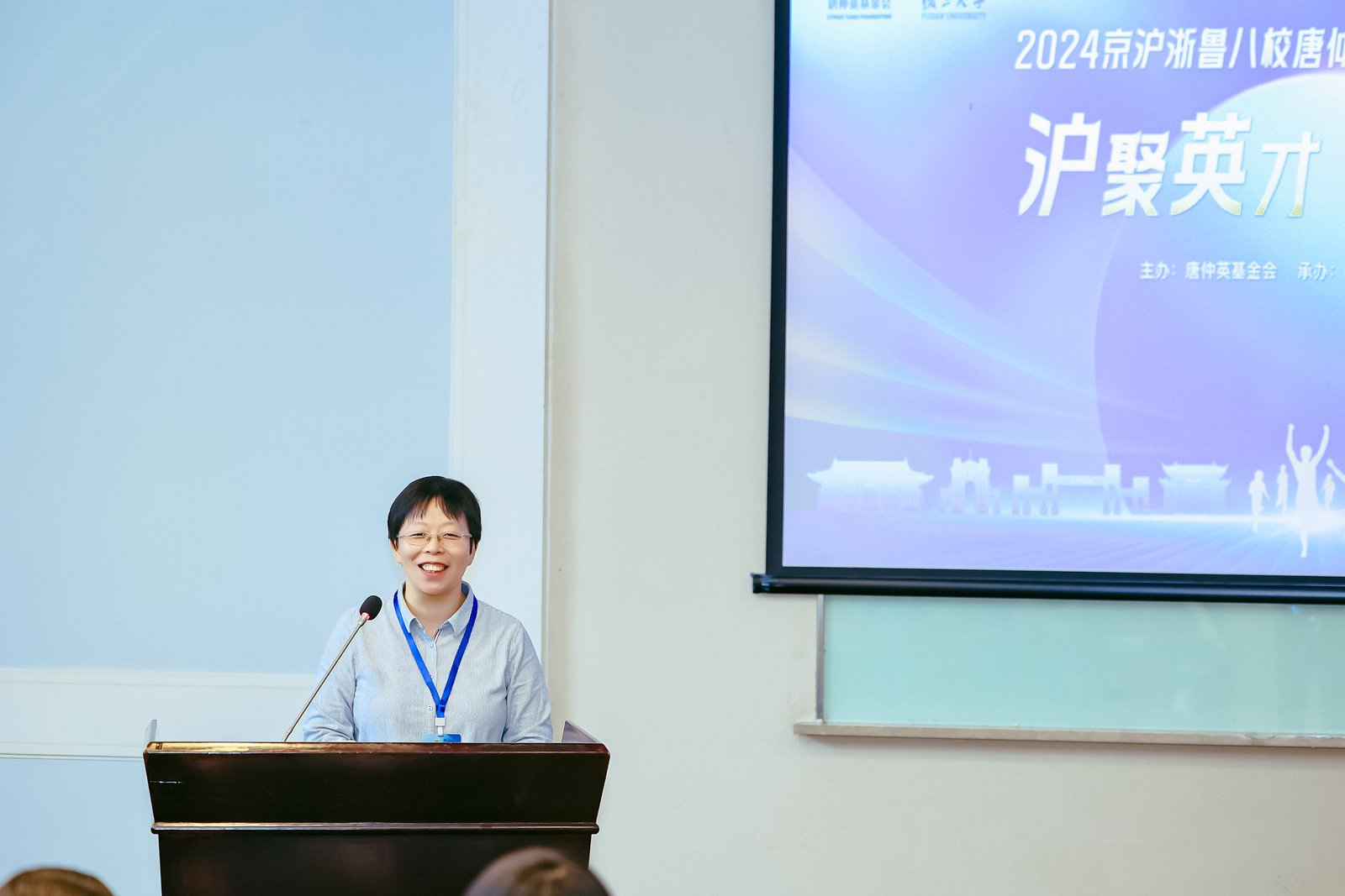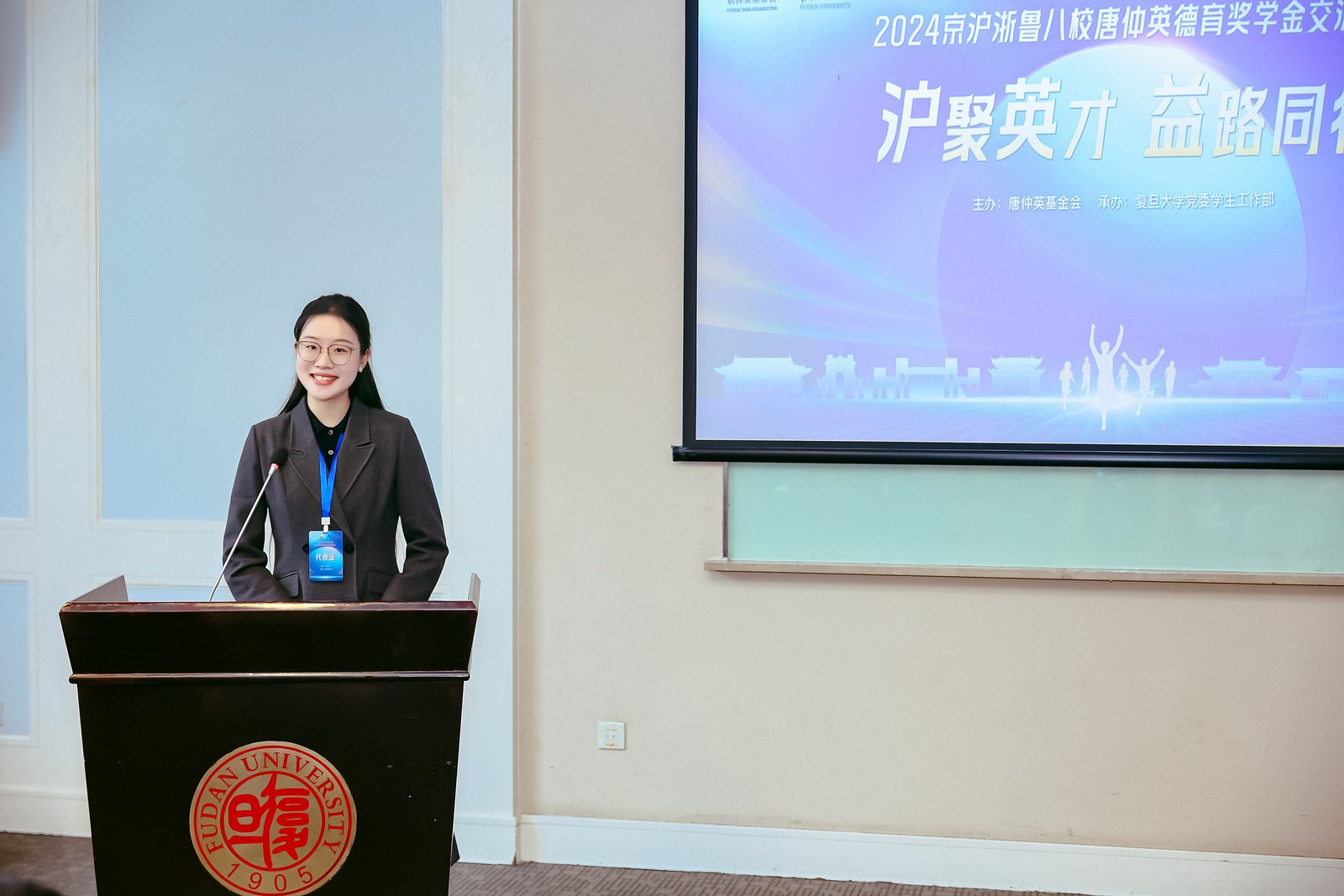 最后,唐仲英基金会项目主管于勤发表讲话,她向在座的师生讲述了唐仲英先生走上公益之路的人生经历以此激励同学们心怀感恩、回馈社会,并再次对复旦办会、八校参会给予的支持表达感谢。