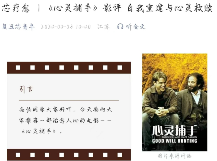 学院推出“芯疗愈”系列科普推送,传播心理健康理念和心理保健知识。常态化推出心理科普、影评推送等,突出网络思政的教育意义,打造品牌心理活动。