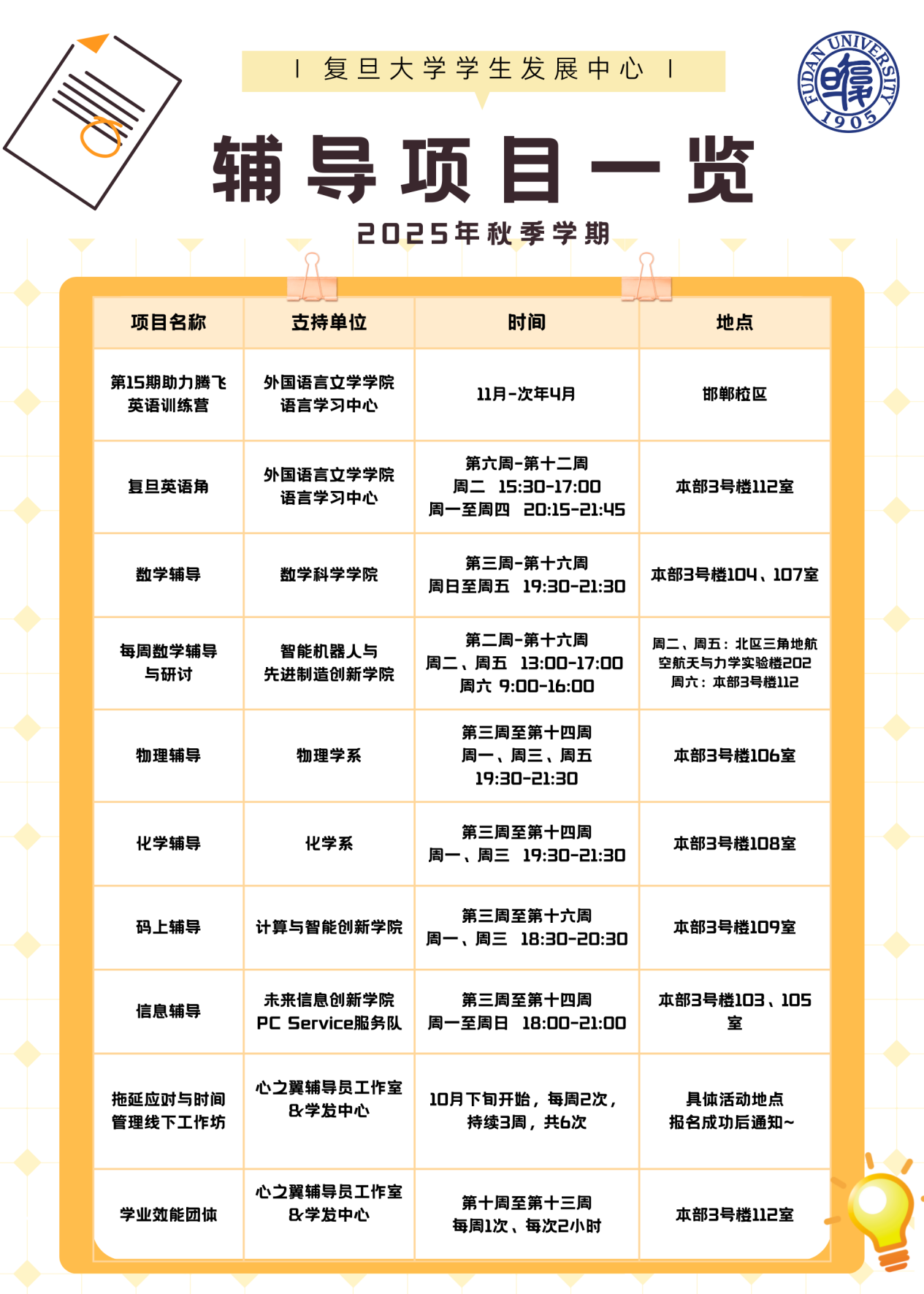 围绕学生基础课程学习痛点,学生发展中心组建由优秀教师、高年级学霸构成的辅导团队,针对数学分析、高等数学、物理、化学、计算机、外语等核心基础科目,开设小班授课、一对一答疑、习题精讲、考前冲刺等多元化辅导项目,切实帮助学生夯实知识基础、破解学习难点。