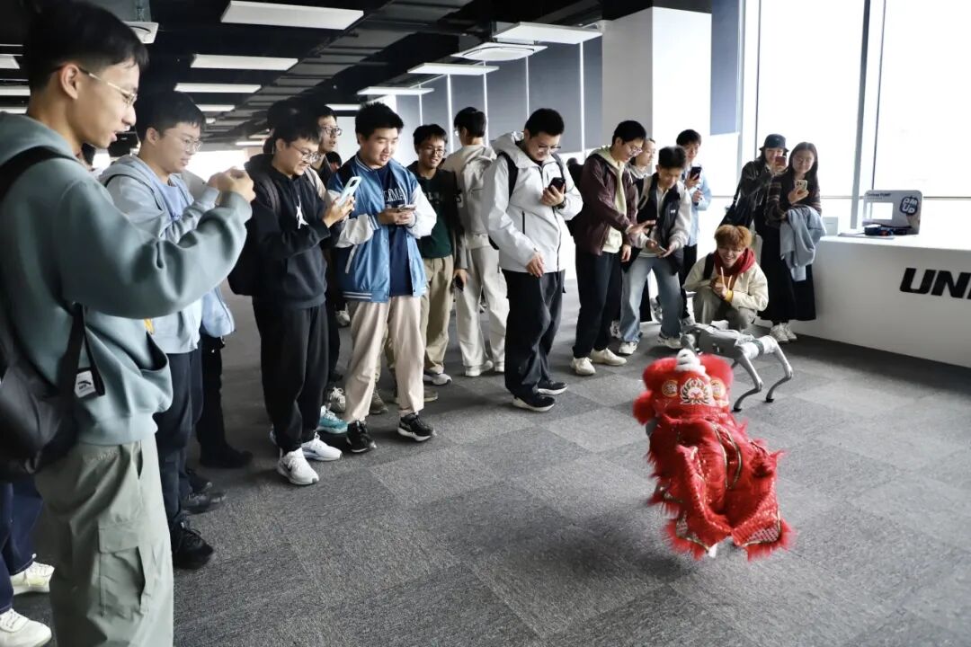 “大家看,门口的这台机器人就是G1型机器人,高1.3米……”学生们围坐成一圈,跟随负责人揭秘宇树科技机器人的“十八般武艺”。