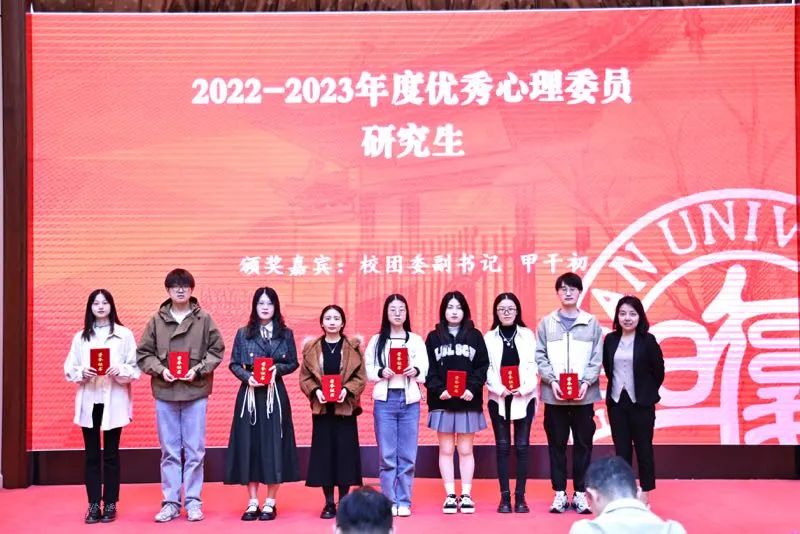 杨媛媛与甲干初老师为获2023年度优秀心理委员的本科生与研究生同学颁奖。