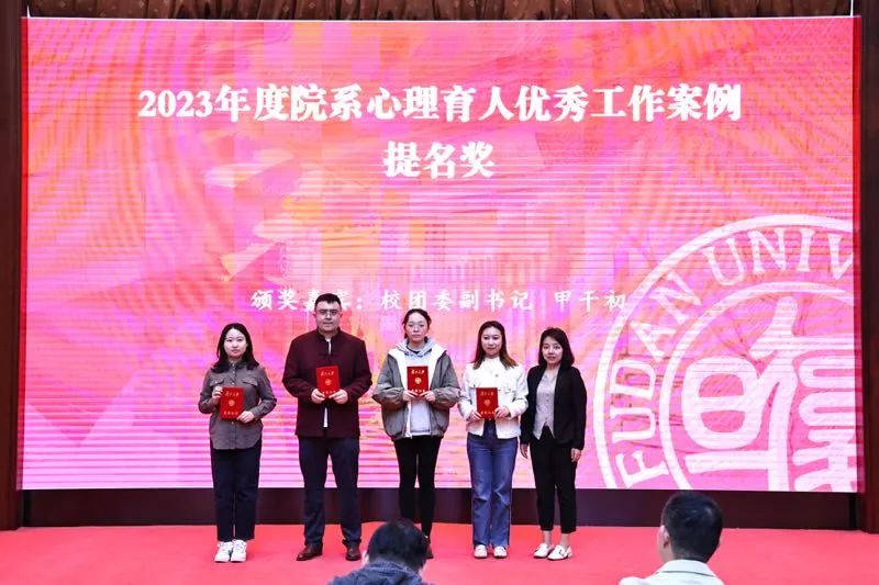 甲干初、厉家鼎和赵小斐三位老师分别为获得2023年度院系心理育人优秀工作案例提名奖和优秀奖的老师颁奖。
