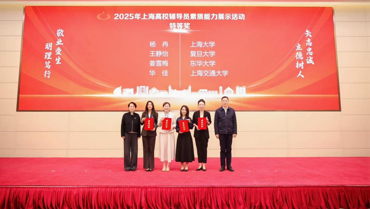 在2025年度上海高校辅导员队伍建设月上,复旦大学获上海市“最美高校辅导员”1人(许妍,全市仅10位),辅导员素质能力展示活动特等奖1项(王静怡)、一等奖1项(陆婷婷),辅导员论坛征文一等奖1项(马心怡、魏澜、吴瑶)、二等奖2项(王懿,陆婷婷)、三等奖4项(宋义蒙、于专宗、程娌,陈澍、沈瑞琪,庄培明,刘久华、蔡心怡)和辅导员团队拓展活动最佳风尚奖。