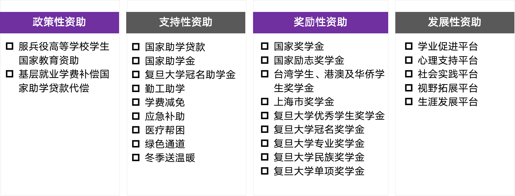 复旦大学秉持“经济资助,成才辅助”的理念,以“助力学生终身发展”为目标,精准定位学生成长需求,搭建全方位的成长平台,实现全过程资助育人。