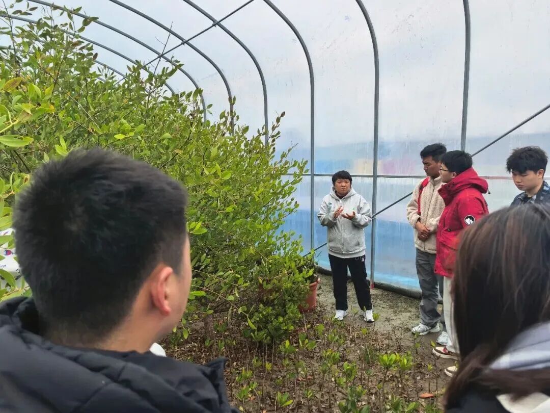 蔡星星老师和南蓬老师带领同学们走入基地大棚,进行实地考察。两位老师如数家珍般地向同学们详细介绍了红树的性状习性,并分享了在上海这片高纬度地区开展红树培育、越冬驯化工作中所遇到的种种技术困难与挑战。大棚内绿意盎然,同学们结合自身在生态学领域的专业知识,与老师们展开了热烈的交流与探讨。那一株株在寒冬后依然坚挺的红树幼苗,仿佛正是“种子精神”最生动的写照——扎根大地,向阳而生。