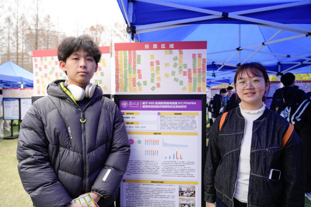 在《基于NGS检测的胃肠间质瘤KIT/PDGFRA基因突变的临床病理特征及预后研究》海报前围了不少人,海报上密密麻麻排列着基因突变的图表,看起来颇为专业,却吸引了几位非医学专业的同学。其中,来自生命科学学院的杨谨祎停了很久。