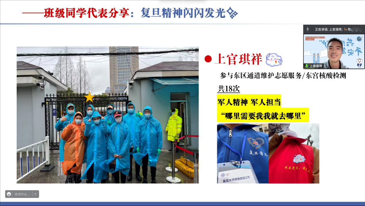 管理学院2021级本科生班会上,七位同学作为代表分享了他们作为志愿者的经历。他们有的作为楼层骨干联系人,守护楼寝大家庭,发光发热尽职尽责;有的参与到所在社区发放抗原自测盒试剂服务;有的作为退伍军人始终保持着军人精神、军人担当,对党员的先进性有了进一步的认识;有的作为校团委青年志愿者协助学校核酸检测、物资运送,并呼吁更多同学参与到志愿服务活动中,结识志同道合的朋友,成为复旦一道亮丽的风景线。