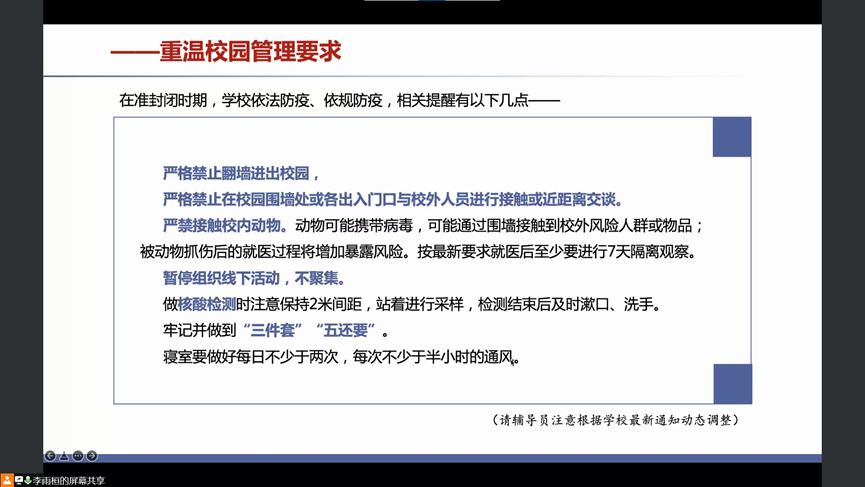 数学科学学院2019级本科生辅导员李雨桓在班会上介绍了因同学违反校园管理要求而被处罚的案例,号召同学们牢记守护大局,人人有责,严格遵守学校有关规章制度,并带领同学重温校园管理要求,特别强调严格禁止翻墙进出校园。随后,李雨桓对疫情期间同学们关心的就医问题作了解答,鼓励同学们保持积极生活态度,保持宿舍清洁,勤锻炼,保持身体健康。