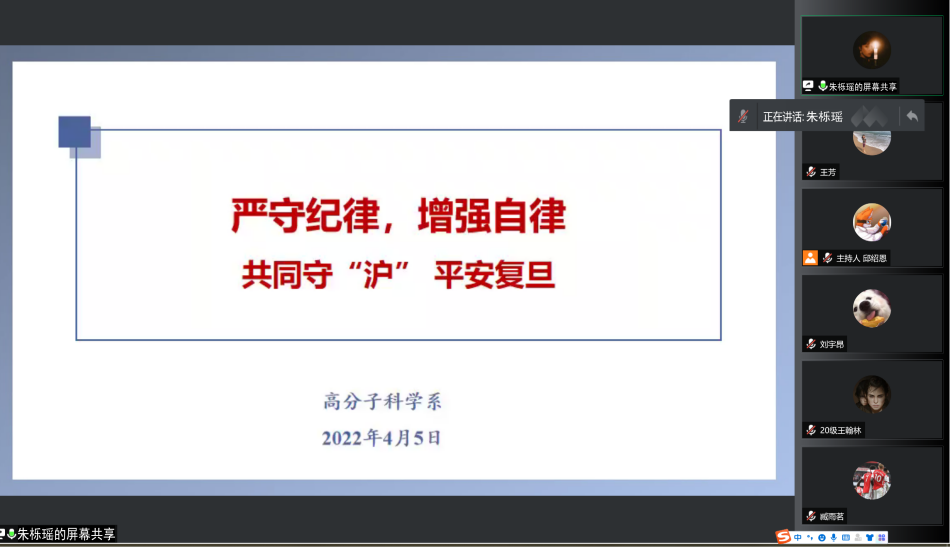 4月4日,学工部发布关于开展“严守纪律,增强自律,共同守‘沪’,平安复旦”主题班会活动的通知,并制作主题班会课件供院系和辅导员工作参考。截止到4月8日,全校共152个本科生班级通过线上活动的形式开展了主题班会活动,实现本科生班级全覆盖。