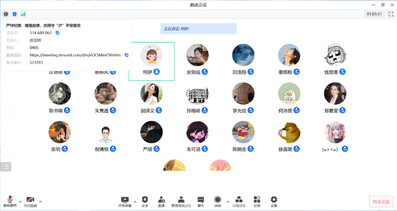 在讨论环节,马克思主义学院2020级本科生望道班的同学们积极发言。孙瑜峤同学认为,在疫情防控的严峻态势下,同学们内心难免浮躁焦虑,但是在特殊情况下更应当修炼内心,修炼“理解”的精神。李光信同学结合个人经历,表示我们应当保持积极心态,不要传播消极情绪;做好分内之事,配合防疫工作;把握机会参与志愿工作,增强责任意识。钱思恩同学认为要从态度上重视疫情防控工作,积极配合核酸检测安排,利用寝室楼群互帮互助解决生活上的问题。陈佳月同学则认为面对疫情严峻态势,我们要做到核酸检测的全覆盖、健康管理的全覆盖和关心关爱的全覆盖。