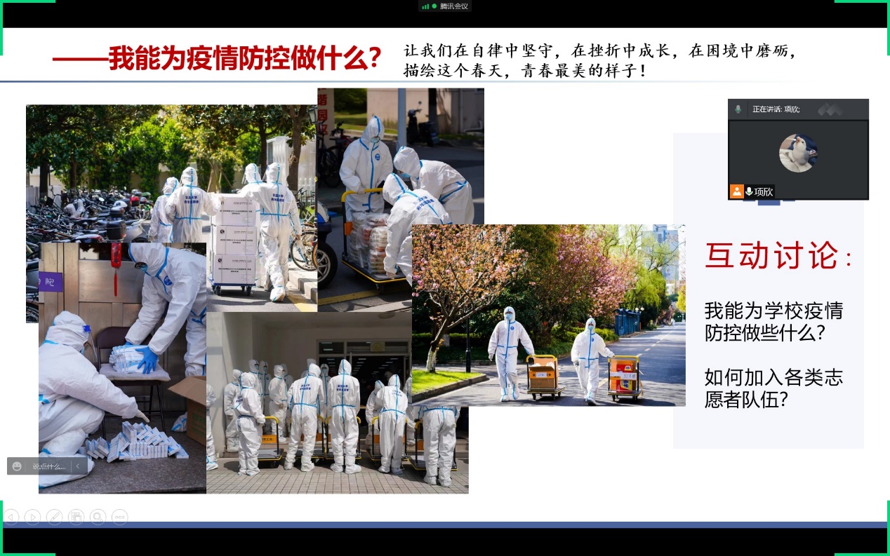 经济学院20UIPE辅导员项欣在班会上向大家介绍了复旦大学校园里的暖心事,包括身边的党员志愿服务队、维持校园自习环境的园区志愿服务队、该班楼宇志愿者张云青、聂煜坤等温暖案例。同时,项欣分享了幂函数模型、SEIR模型等关于新冠疫情分析的文章。项欣鼓励同学,在情绪到来的时候,要一起学会用科学知识作为自己的底气;明白纸面上的数字背后是一个个活生生的生命个体,传染病不仅涉及健康,还涉及经济和家庭命运,要多方面地思考问题。