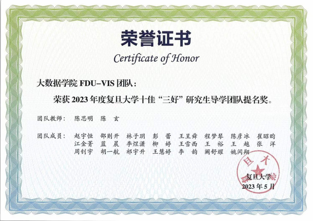 在2021年-2024年间,陈思明老师指导的本科生们先后组成3个队伍参与可视化领域国际顶级竞赛IEEE VAST Challenge(CCF A类国际顶会学术竞赛)和IEEE PacificVis Storytelling Contest,获得一项Outstanding Award和Contest Winner。培养的许多本科生、研究生与博士生也获得国家奖学金与上海市优秀毕业生、复旦大学优秀毕业生等称号。FDUVIS实验室也因其交叉学科研究被评为相辉课题组,并获得复旦大学十佳”三好“研究生导学团队提名奖。